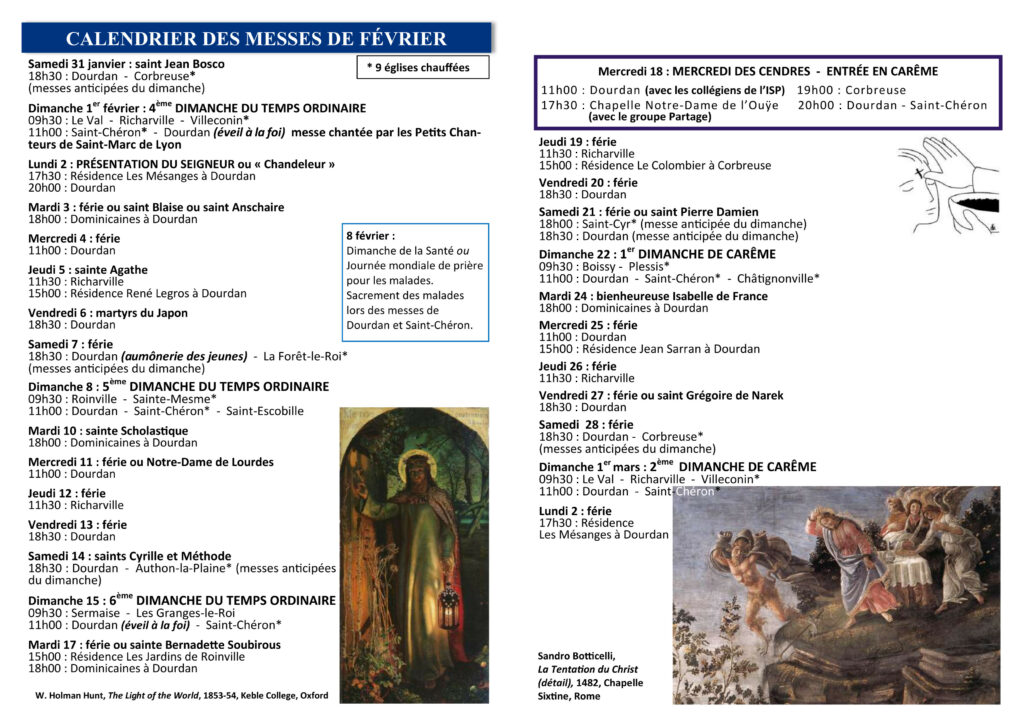 Vie du secteur Plus de masque, mais restons attentifs et confiants en Dieu, en gardant les gestes sanitaires. | Annonces dans le Bulletin Merci de Communiquer vos Annonces pour le mois à venir par courriel avant le 15 du mois en cours | Feuille paroissiale Toutes les infos des célébrations et de la vie du secteur.